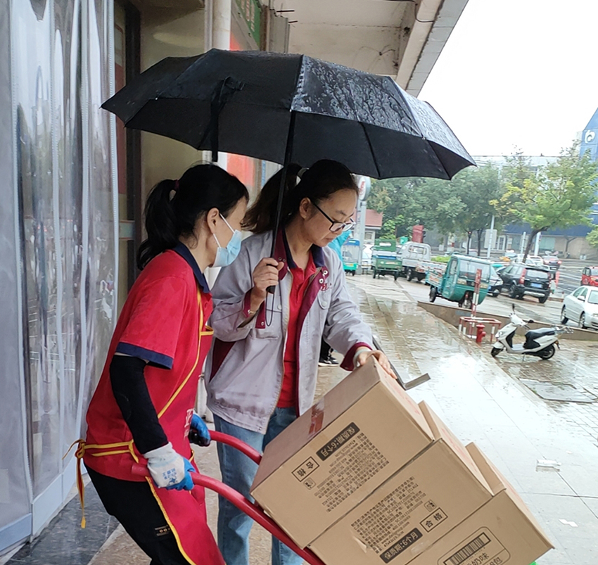 10月18日,民生店同事齊心協力、冒雨奮戰,確保商品未濕損的同時迅速卸貨,以便后續團購業務及時配送。